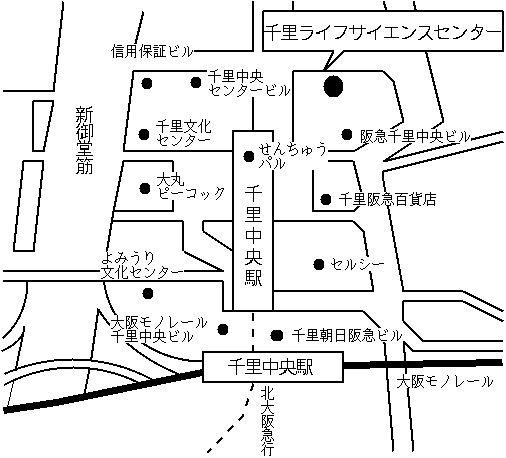 「交通案内」 千里ライフサイエンスセンタービル 大阪府豊中市新千里東町1丁目4番2号 電話 06−6873−2010 FAX 06−6873−2011 ● 地下鉄千里中央駅前(御堂筋線 → 北大阪急行) ● 大阪国際空港までクルマで約15分 ● 新大阪駅まで地下鉄で約13分 ● 大阪梅田まで地下鉄で約19分